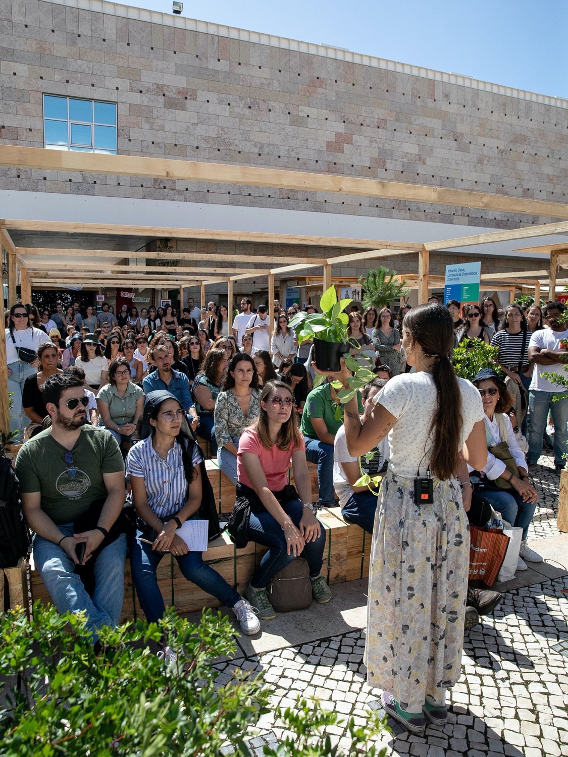 Foi um projeto que veio a seguir à pandemia, em que quisemos criar um ecossistema em que as pessoas pudessem aprender sobre sustentabilidade. Um supermercado só de marcas responsáveis não existe. A maior parte das pessoas não tem acesso a cientistas, investigadores e personalidades políticas, mas eu tenho. Por isso, quisemos criar uma experiência imersiva do que seria viver numa cidade mais sustentável. O que implica acesso livre à educação, a transportes e que as marcas à nossa volta apostem em economia circular. Tudo teria de ser feito para vivermos uma experiência do que poderia ser, que ainda não é, mas que, ao mesmo tempo, já estava a acontecer em Portugal, porque os cientistas que trouxemos eram portugueses. Na primeira edição tivemos 50 palestras e atividades. Mostrámos coisas tão práticas como consertar sapatos ou fazer sabonetes. Coisas práticas e teóricas para as pessoas se sentirem capacitadas para a sustentabilidade.